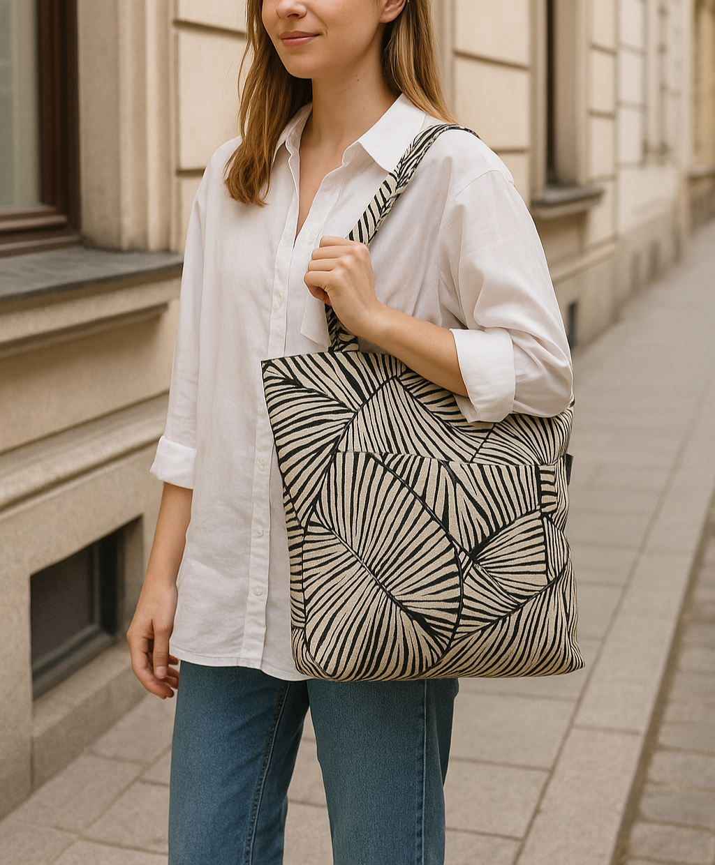 This Leaves Tote bag is handmade with care, featuring large leaves patterns for a stylish look. It includes one outside pocket and a double pocket inside with a key cord, making it easy to organize your essentials. Perfect for everyday use, this tote combines practicality with a casual, chic design. Featuring a magnetic button closure, it keeps your essentials secure while offering easy access.